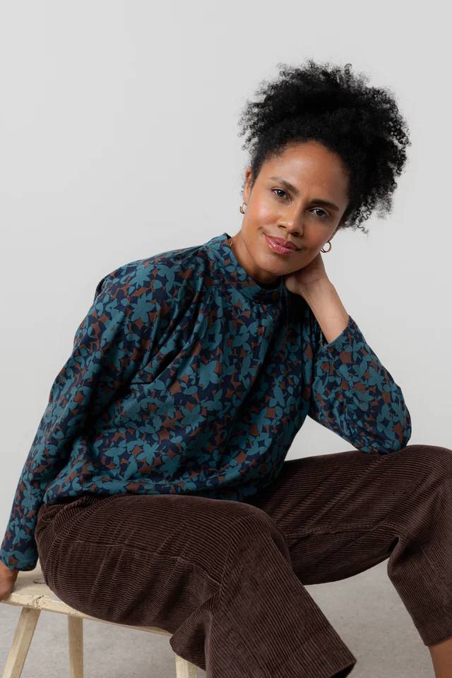 A high neck with slight gather and button back key hole opening. Batwing sleeves create a relaxed fit for a flattering drape