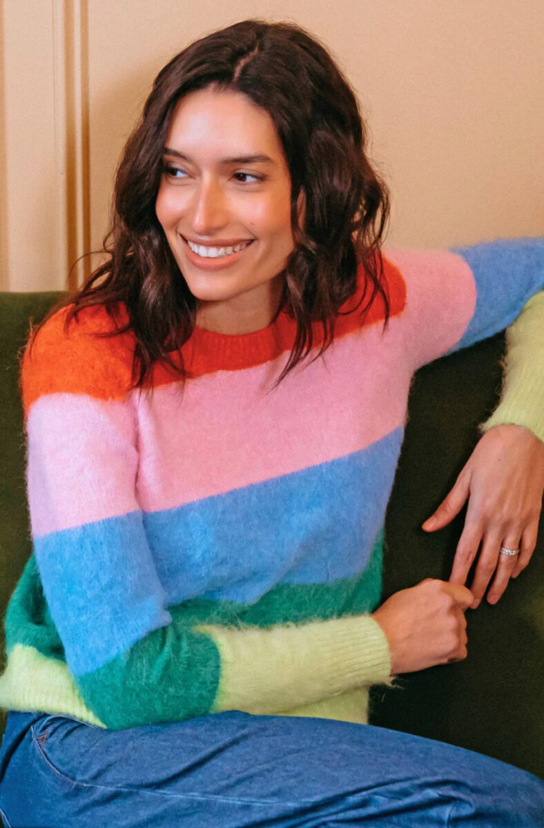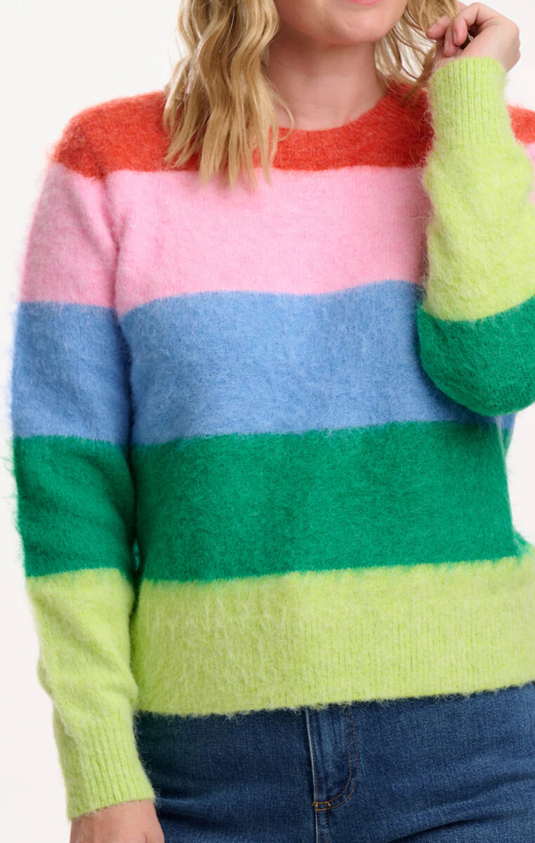 The Dayna Jumper is designed to brighten chilly days with its bold, wide rainbow stripes in red, pink, lilac, green, and yellow. Made from a cosy fluffy knit, it combines a relaxed fit with soft comfort, creating the perfect balance of warmth and standout style.