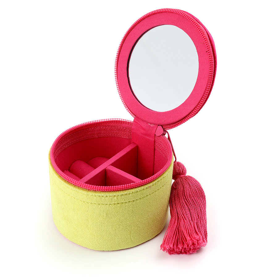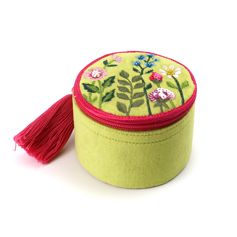 Lime velvet trinket box with embroidered and embellished floral meadow scene and tassel zip, a pretty little box for rings, bracelets and keepsakes.