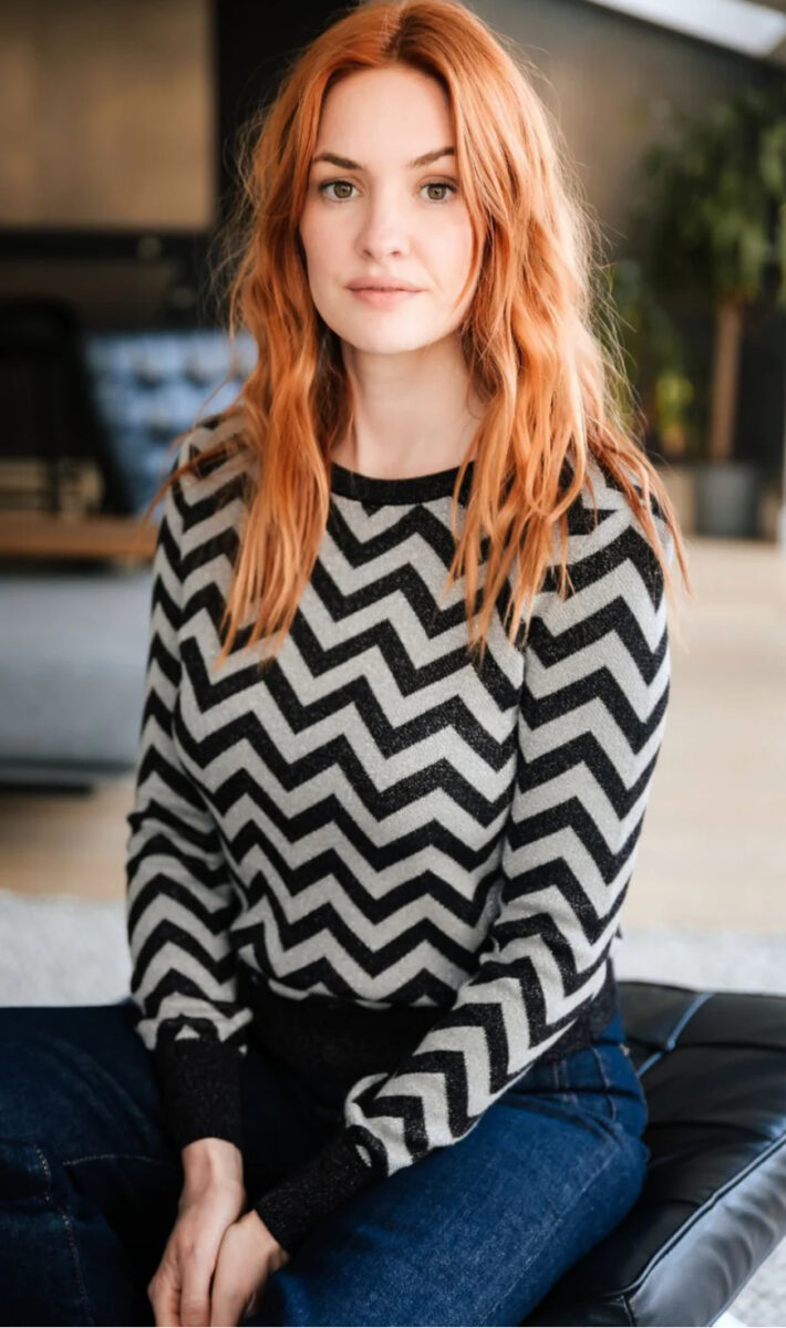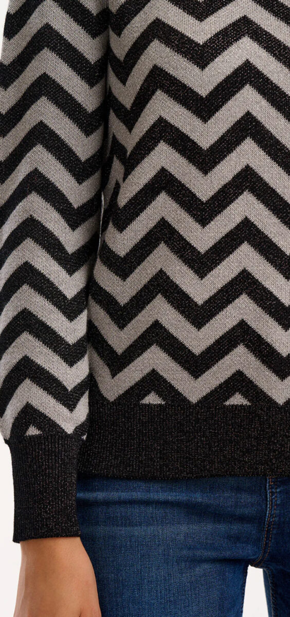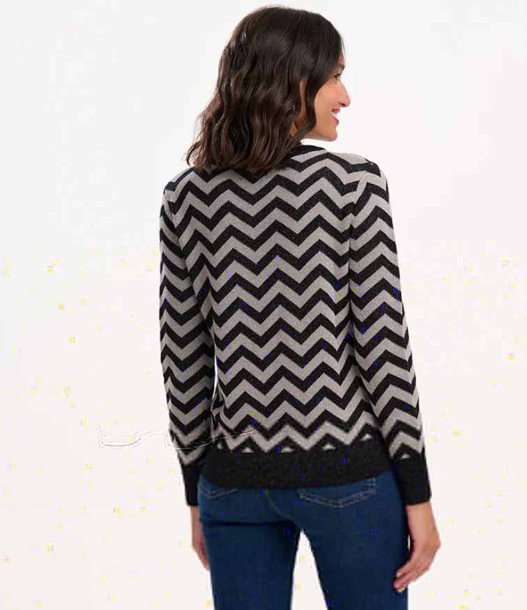 The Rowena Jumper is a fitted knit designed to add a playful pop to your wardrobe. Made from a sparkle-infused, lightweight cotton-mix, it features a classic crew neckline and a slightly shorter length, perfect for pairing with high-waisted jeans or skirts. The bold silver chevron stripes against a black background create a striking contrast, bringing a fresh twist to a timeless shape.