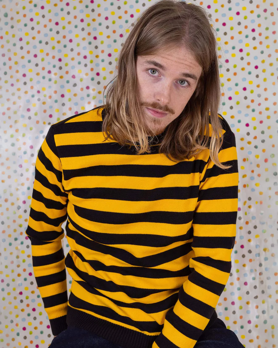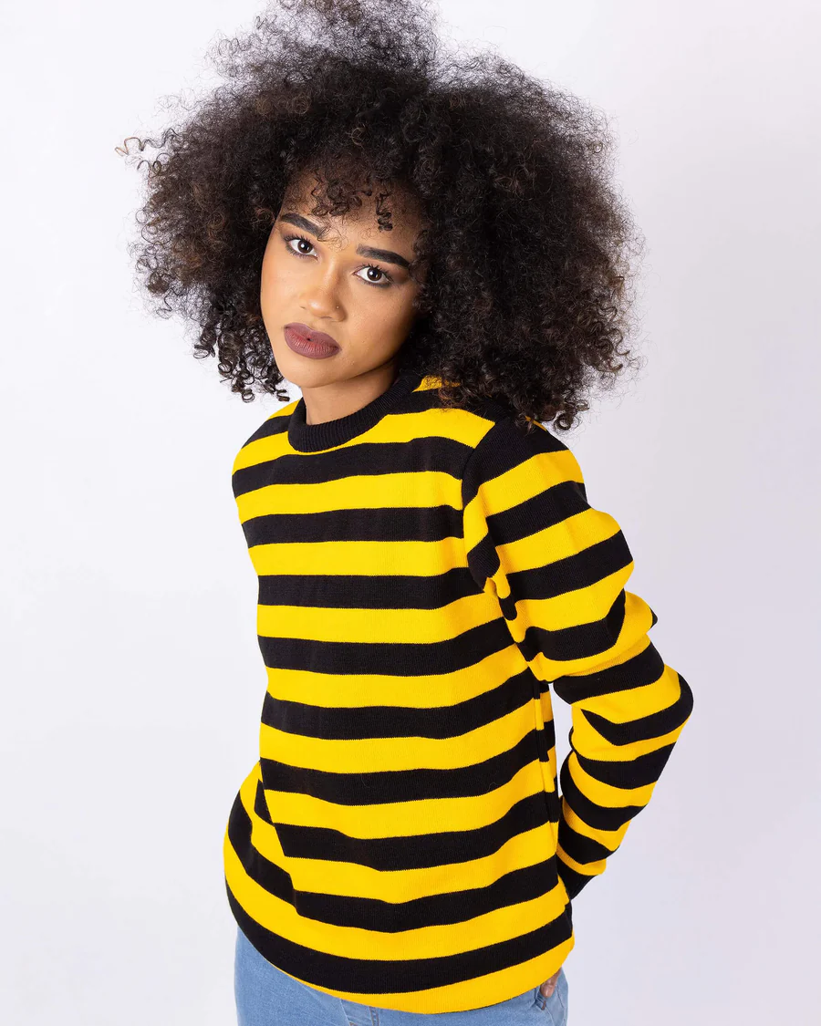 Check out this fabulous yellow and black striped jumper from Run & Fly. Get Them Cool Indie Vibes with This Retro Jumper. Made in England!